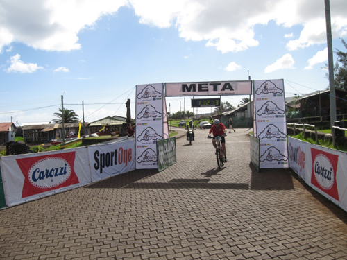 El sábado era el turno del Mountain Bike en un circuito de 30 Km prácticamente todo de tierra, aunque en buen estado. El día anterior estuvimos un par de horas dedicados a buscar una buena bicicleta para arrendar. Encontré una Trek bastante decente. Le puse mis pedales, regule cambios y frenos y listo. La carrera parte con una larguísima subida al volcán Orongo. Luego el retorno en bajada. Ahí me doy cuenta que voy en punta y ampliando la ventaja. Decido regular el ritmo y reducir el riesgo. Aprovecho, por supuesto, de admirar una vez más el entorno. Nos vamos al lado Este de la isla y luego nos cruzamos para el lado Oeste, donde emprendemos el regreso a Hanga Roa. Voy en punta, con moto de carabineros y con cámaras de televisión. Sufro una caída, que la cámara no capta y pierdo el sillín. Tengo que hacer los últimos 10 Km parado en los pedales. Llego a la meta en 1:32:13.