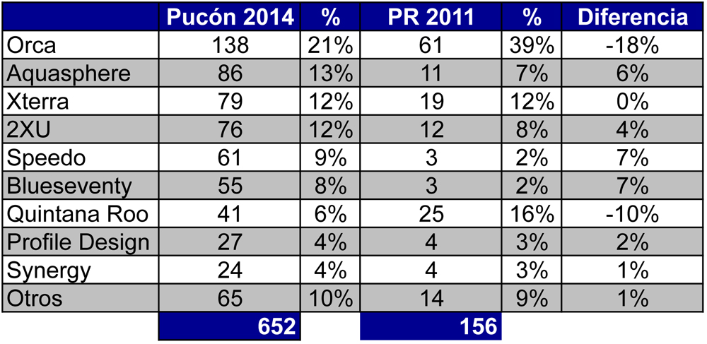 En términos absolutos Orca sigue dominando el mercado nacional, sin embargo pasó de un 39% de las preferencias a sólo el 21% con una pérdida brutal del 18% del mercado. El segundo lugar fue alcanzado por Aqua Sphere con un 13% de participación. Lo interesante en este caso que en la muestra de Piedra Roja sólo ocupaba el 5° lugar con sólo un 7%. Sin duda Aqua Sphere es uno de los ganadores de este periodo. Manteniendo el 3er lugar en ambas muestras esta XTerra con un interesante 12% de de las preferencias. Luego aparece 2XU que gana 4% en estos 2 años y medio. En 5° y 6° lugar están 2 marcas que en Piedra Roja prácticamente no tenían presencia y que ahora en Pucón se tomaron el 9% y 8% del mercado. Nos referimos a Speedo y Blueseventy. El 7° en el listado es un caso de estudio. Cuesta entender que una marca como es Quintana Roo se de el lujo de perder 10% del mercado en tan poco tiempo. No sólo eso. En la muestra de Piedra Roja era la 2ª en carrera. Cierran el listado Profile y Synergy con un 4% cada una.