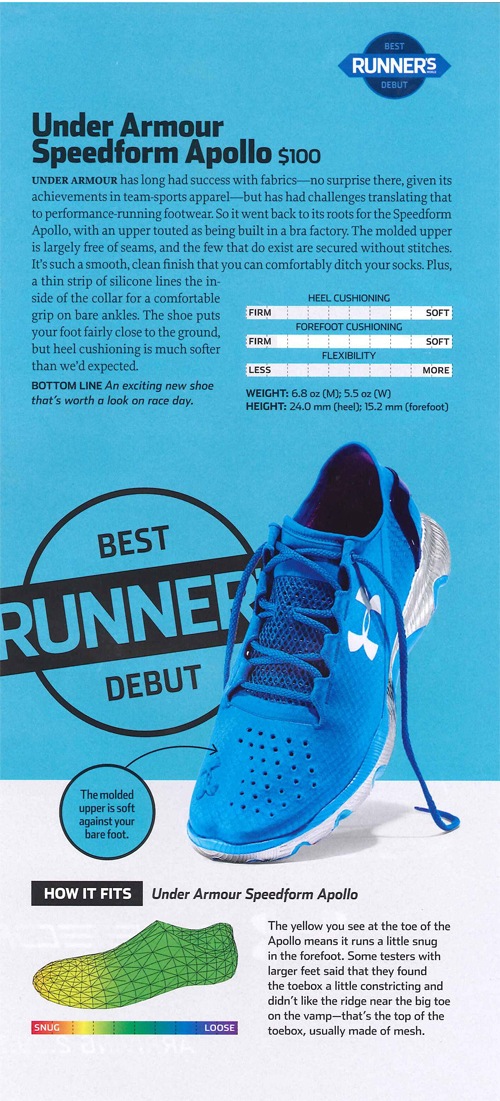 La revista Runner´s World presentó recientemente su Guia de Zapatillas de Primavera y le dio el premio a “mejor debut” a la Speedform Apollo de Under Armour.