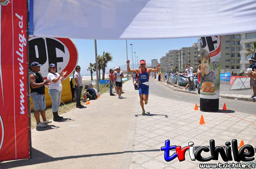 Entrando de lleno en lo deportivo digamos que Luciano Farías ganó de punta a punta. Les metió 2 minutos en el agua a 2 grandes nadadores como son Claudio Nieto y Tomas Olavarría. Más atrás salían Javier Tisi, Cristian Möller, Sebastián González y el crédito local Cristóbal Fernández. Todo siguió más o menos igual hasta cerca del final del ciclismo, en que Olavarría se queda dejando a Nieto segundo en solitario y González que pega un palo al grupo de 4 que venía trabajando desordenadamente y consigue bajarse a correr en 4º lugar, a pesar de sufrir una penalización que lo detuvo unos segundos en T2. Farías pone velocidad crucero en el trote y gana sin despeinarse, aunque él diga que sufrió (es todo un caballero). Claudio Nieto se baja a correr y se da cuenta que le puso mucho en la bici, se vio muy apretado desde el principio. Olavarría con 17 años y empezando en estas distancias se ve más entero y se la juega por el 2º lugar. En cuarto lugar se baja Sebastián González de Route y muestra inmediatamente las cartas: un trote sólido. Tanto así que sobrepasa a Nieto y Olavarría y llega en 2da posición. Tercero es Tomás Olavarría, cuarto es Nieto. La lucha por el 5º lugar fue infartante entre los uniformados Javier Tisi y Daniel Vargas, ganando el primero en un sprint espectacular. Lo malo es que en la entrega de premios y para extrañeza de todos le dieron el 5º lugar a Vargas. Lamentablemente no se informó en forma oficial lo que había sucedido. Se rumoreaba que a Tisi lo habían penalizado con 30 segundos, pero el mismo corredor hasta el día siguiente no sabía el motivo de su penalización. Nos parece que las penalizaciones deben ser informadas primero a los afectados, quienes deberían tener derecho a apelar.