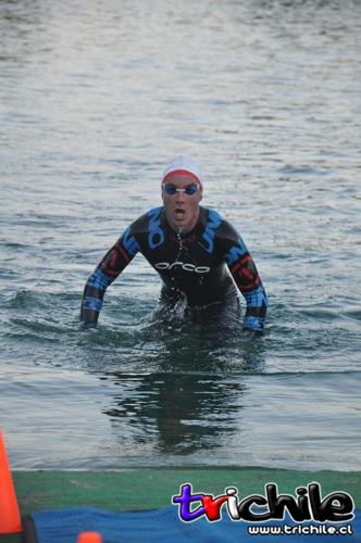 Durante la natación Rodrigo Nilo (Team Bustos) se llevó todas las miradas, saliendo del agua en 17:10, un tiempo que le hubiera permitido nadar sin problemas con los elite del sábado… Más atrás venían los favoritos: Edgardo Opazo (Brain Team), Francisco González (UC) y Michel Uteau (Full Runners).