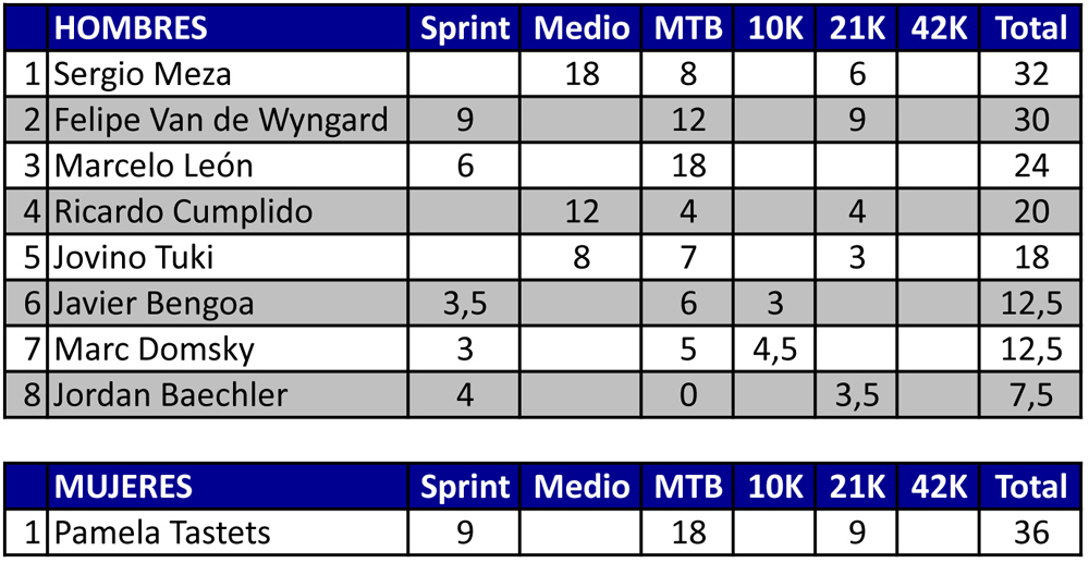 Entre los hombres el ganador fue Sergio Meza (Team Bustos) con 32 puntos gracias a su triunfo en el medio Ironman, su tercer lugar en el MTB y su segundo en los 21K. Segundo fue nada menos que el olímpico Felipe Van de Wyngard (Atleta Timex) quien pese a ganar el sprint y los 21K sólo totalizó 30 puntos. Tercero fue el local Marcelo León Pakarati con 24 puntos. Los resultados finales pueden apreciarse en la siguiente tabla: