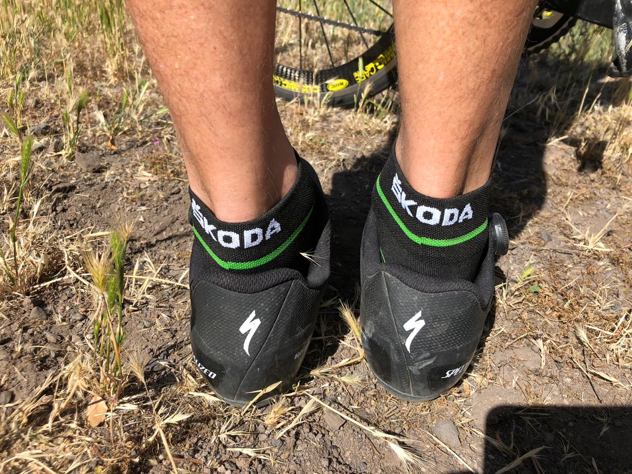 Los calcetines calzan a la perfección, tienen un par de tiras verdes decorativas y la palabra ŠKODA estratégicamente colocada hacia atrás, como para amedrentar al que chupa rueda. Bonitos y cómodos los calcetines. También gracias por la caramagiola, que no chorrea agua, que es lo único que pido.