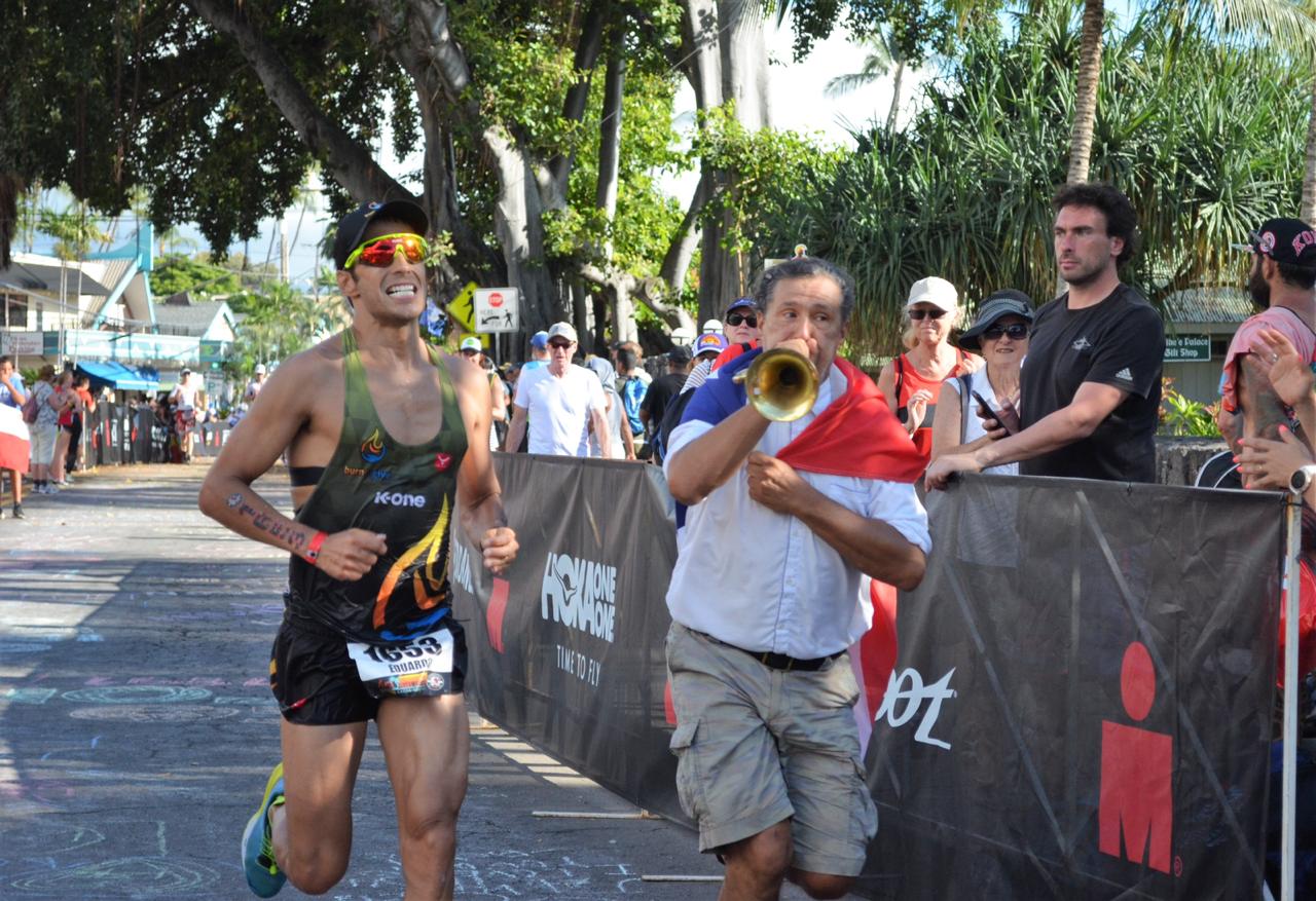 Excitado toma todo lo que pueda ayudar: una trompeta y la infaltable bandera Chilena. En el último segundo antes de salir decide desatornillar un palo de escoba para poner la bandera. Se dirige al sector de la meta y se instala en la esquina de Hualalai Road y Alii Drive a unos 500 metros del final. La espera se hace eterna. Aparece primero Mark Allen. Siete minutos después aparece Cristian. La emoción es intensa y el protocolo desaparece. Ya no basta con verlo pasar. Rolando Hidalgo decide lanzarse a la aventura y ser parte de este inmenso logro. Corre desbordado a un ritmo frenético para sus estándares. Codo a codo con Cristian. Como si lo conociera de toda la vida. Le pasa la bandera y él continua tocando la trompeta hasta pocos metros antes del final. Por un minuto se sintió en Chile y esa emoción se plasmó en esta imagen. Rolo nunca más se olvidaría del Ironman. Ha recibido con un enorme cariño a todos los triatletas chilenos que llegan cada año a Hawaii. Participa con mucho entusiasmo de la Parade of Nations que se realiza días previos a la carrera. Este recuerdo es un agradecimiento de todos los que conocemos de su simpatía y sencillez.