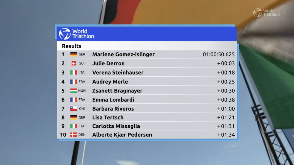 La ganadora de la carrera, en formato sprint (750-20-5), fue la alemana Marlene Gomez-Islinger con un crono de 1:00:51, que le arrebató el primer lugar en los últimos metros a la suiza Julie Derron, que finalizó 2da (+4seg). Cerró el podio la local Verena Steinhauser (+19seg).