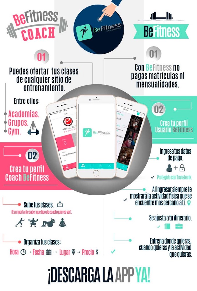 BeFitness cuenta con 2 aplicaciones, por un lado está la del Coach, centro, academia o gimnasio, en dónde estos profesionales suben información de sus clases que quieren ofertar, precios, cupos, horarios, tipo de entrenamiento etc. Esta información será visualizada en la App del usuario de manera georreferenciada y así al navegar por la aplicación encontrarán la actividad física que necesitan o quieren y con un sólo click podrán comprarla y con esto, ya están registrados para asistir a esa única clase.
