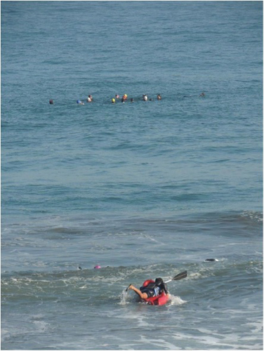 La clínica tenía como objetivo: iniciación al mar, cómo meterse, cómo salir, orientación, manejo de la respiración en agua con movimiento, nado en grupo. Contaron con apoyo de kayak para cualquier emergencia (a cargo de Mauricio Ortiz).