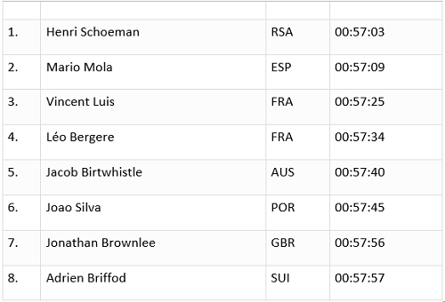 Henri Schoeman (bronce olímpico en Río) fue el primero en salir del agua y formó junto a Johnny Brownlee, Richard Varga, Ben Kanute, Aaron Royle y los franceses Luis y Bergere un grupo que lideró los primeros giros de ciclismo. En el 3er giro de 5, Schoeman rompió el pelotón y se fue en solitario, lo que le permitió bajarse con una ventaja de 15 segundos sobre sus perseguidores y de 20 segundos sobre Mario Mola, su principal amenaza. Como era de esperar, el español Mario Mola tuvo el mejor trote del día con 14:27 para los 5K, pero sólo logró descontarle 14 segundos al sudafricano llegando a la meta sólo a 6 segundos.