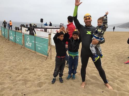 Llegó el día, un día gris, de llovizna, llegamos a la playa, miré las boyas, que parecían estar casi en el horizonte. No pueden ser 800 metros! La angustia comenzó a apoderarse de mí. Un triatleta experimentado me comentó: “El problema es que el viento y las olas han corrido las boyas”, me recorrió una sensación de ¿¡qué hago aquí!? Dan las instrucciones y dispararon, el grupo entró rápido al agua, yo me quedé atrás, tímido y cauto, con miedo, tomándome la natación con tranquilidad, el agua estaba helada y el mar oscuro, recordé mis clases en la piscina y comencé mi primer intento de nadar, el cual no duró mucho, no veía nada, lo que me hizó nadar en estilo water polo, con la cabeza afuera, pasé la primera boya y las ganas de abandonar empezaron a crecer, no era el único, ya que vi a un triatleta que comienzaba a retroceder, dudé, pensé en mis hijos y es lo que me hizo seguir, miré la segunda boya y ésta parecía alejarse, tomé aire y vamos adelante, en ese momento el grupo ya se había alejado, me sentía solo en el mar, miré a mi alrededor y vi a los cayaquistas y un bote pescador, lo que me hacía sentir seguridad. Llegué a la segunda boya cuando escuché unos gritos pidiendo ayuda, un segundo triatleta abandonó ayudado por el cayak, nuevamente me recorreió una sensación de angustia que podría frustrar mi debut, miré la tercera boya y pensé que nadar horizontalmente al mar se me hará más fácil, nada de eso pasó, fue igual de difícil, al llegar a la tercera boya comencé en diagonal hacia la playa, en ese momento no daba más, me puse de espaldas, para tomar aire y descanzar. Al incorporarme, se me perdía la playa, le pregunté a un cayaquista, hacia dónde estaba la playa! Me apuntó con el dedo y yo, confiado comencé a flotar hacia esa dirección, vi la playa, las personas se veían como hormigas, pensé que faltaba mucho, pero es el último tramo y no podía aflojar. Había leído que uno tiene que nadar hasta que tus manos toquen el fondo, ya que al incorporarse, el agua te llegaría a las rodillas y puedes salir del agua más fácilmente, nada de eso pasó, apenas toqué fondo con la punta del dedo, me paré, sentí un gran alivio de tocar tierra, salí caminando, de los últimos de mi grupo, fueron los 33 minutos más largos de mi vida, literalmente 33 minutos debajo del agua.